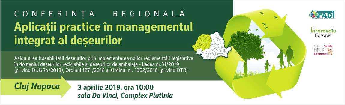 Federația Asociațiilor de Dezvoltare Intercomunitară (FADI) în parteneriat cu revista INFOMEDIU EUROPA, vă invită să participați la CONFERINȚA Regională “Aplicații practice în managementul integrat al deșeurilor. Asigurarea trasabilității deşeurilor prin implementarea noilor reglementări legislative în domeniul deșeurilor reciclabile și deșeurilor de ambalaje - Legea nr.31/2019 (privind OUG 74/2018), Ordinul 1271/2018 și Ordinul nr. 1362/2018 (privind OIREP)”, eveniment dedicat dezbaterilor cu