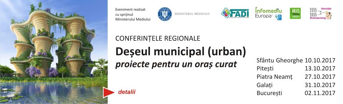 Federația Asociațiilor de Dezvoltare Intercomunitară (FADI) și Revista INFOMEDIU EUROPA in colaborare cu MINISTERUL MEDIULUI având ca invitați reprezentanții Autoritatii Naționale de Reglementare pentru Serviciile Comunitare de Utilități Publice (ANRSC), în parteneriat cu Asociația IRIS TERRA GREEN și Asociația BRAINSTORMING vă invită să participați la cele 5 CONFERINȚE REGIONALE “Deșeul municipal(urban) - proiecte pentru un oraș curat” evenimente dedicate dezbaterilor interinstituționale cu